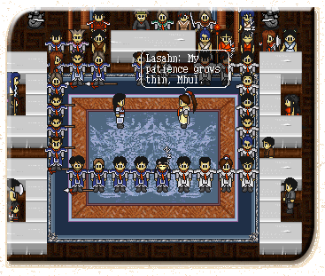 Tensions between Buya and Koguryo continued long after the pirate kidnapping of Lasahn and steadily increased to the point that diplomatic talks were needed. Witnesses claimed that during the princess' birthday celebrations at the Buya Palace, Prince Mhul shouted out insults for the kingdom to hear against Lasahn and her people. [[M'hul] was insistent this never happened. At one last attempt to negotiate for peace between the kingdoms, the royals met at Tribunal Hall in the Kugnae Palace with envoys from both armies present. The talk escalated into argument as Lasahn demanded an apology for the insults Mhul claimed he never uttered, despite witnesses present who said otherwise and war was declared.