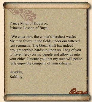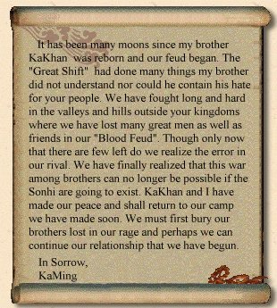 With the nomads of KaKhan defeated, Prince M'hul had wondered what might become of the Sonhi tribe from the north-west. Scouting groups had been sent to search for any clues of the Sonhi's intentions. A messenger had returned with the very news M'hul had feared. KaMing, the leader of the Sonhi and brother to KaKhan, had received word of his brother's demise and was furious. He demanded four million coins as only the start of compensation for the Khan loss.